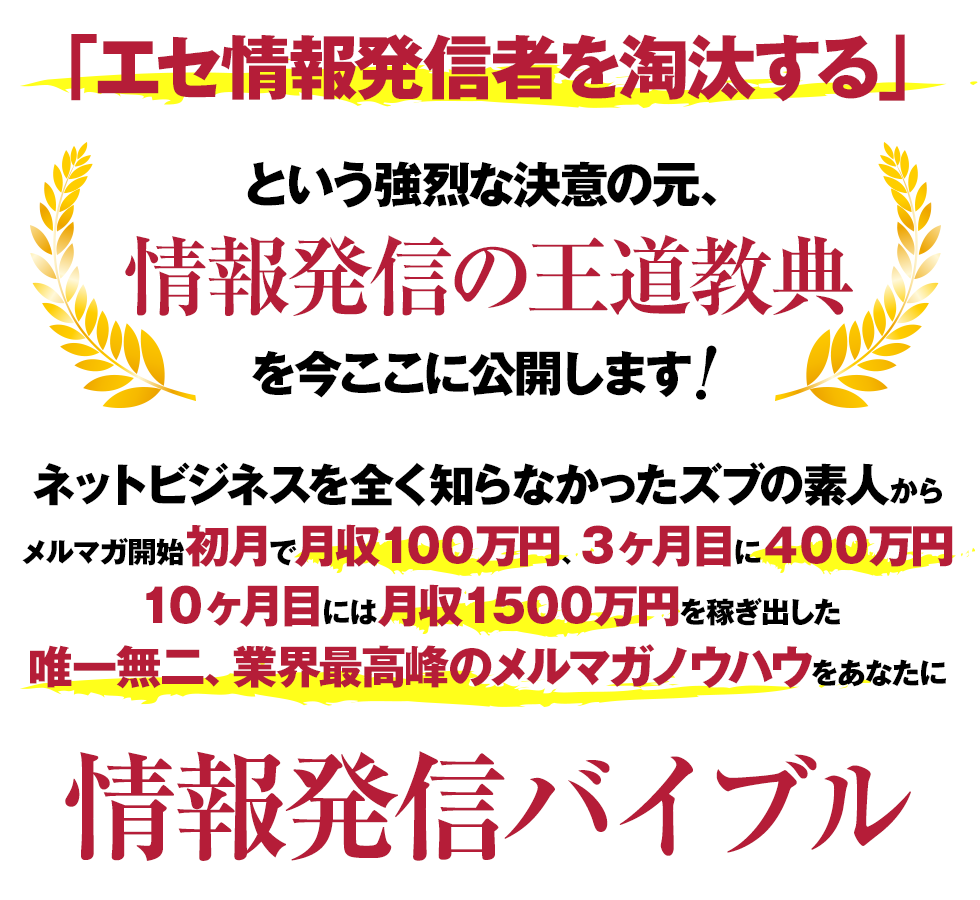 - メルマガを始めてわずか1ヶ月で4万円の情報教材を50本以上成約して月収100万円、さらに、わずか3ヶ月で24万円の高額塾を35本成約して月収400万円を達成できた秘密とは?(これらはネットビジネスをまったく知らなかったズブの素人が半年以内に成し遂げたことです)